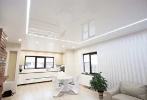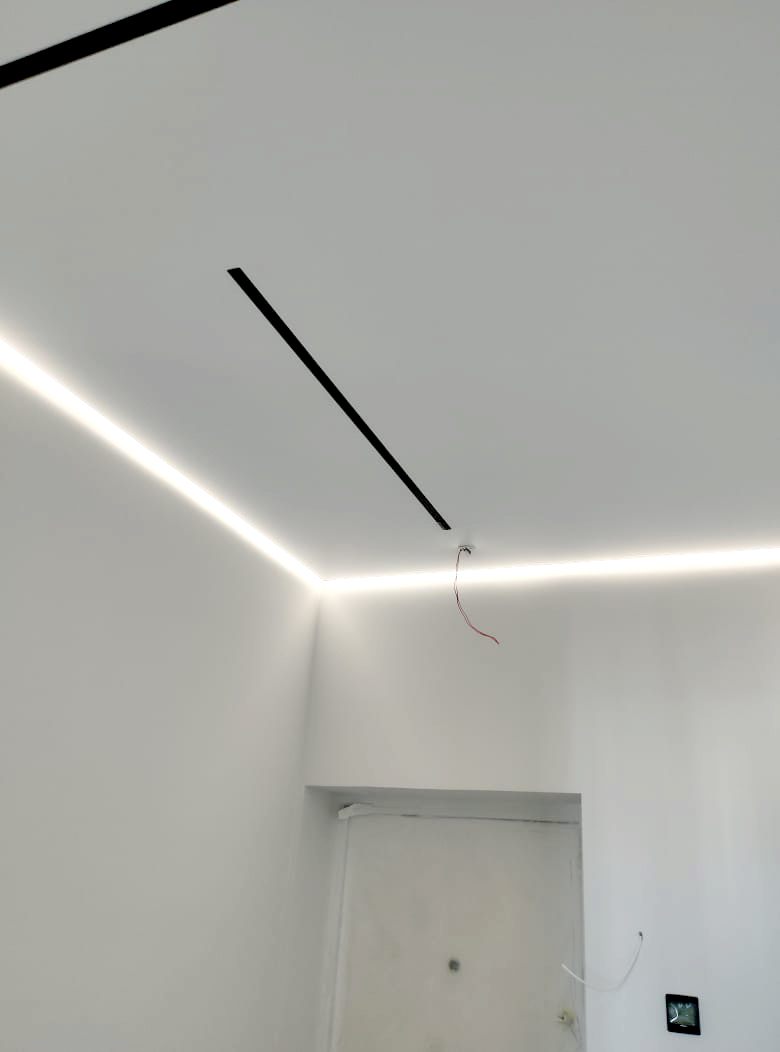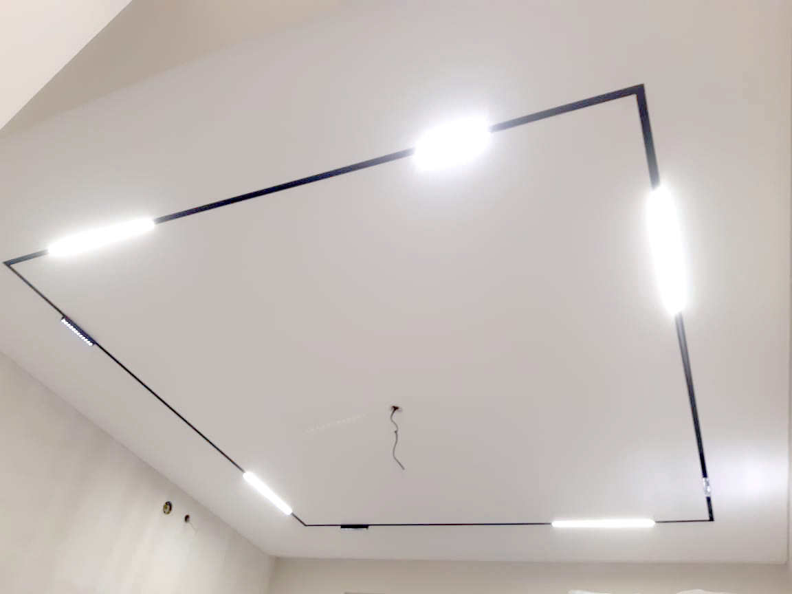 Что включает монтаж: Монтаж сложных многоуровневых конструкций, установка магнитных трековых систем, шинопроводов, интеграция световых линий и «парящих» профилей, установка инженерных элементов (люки, вытяжки).