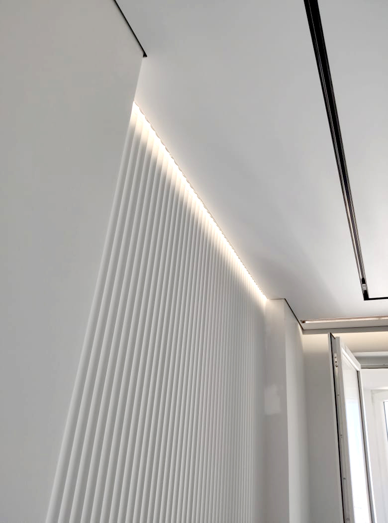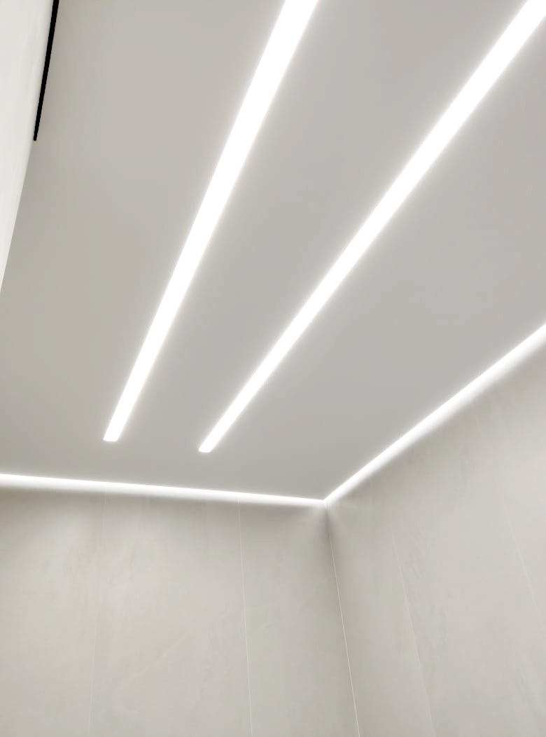 Что включает монтаж: Установка натяжного потолка на выбор, монтаж и подключение световых линий, установка теневого или «парящего» профиля с подсветкой.